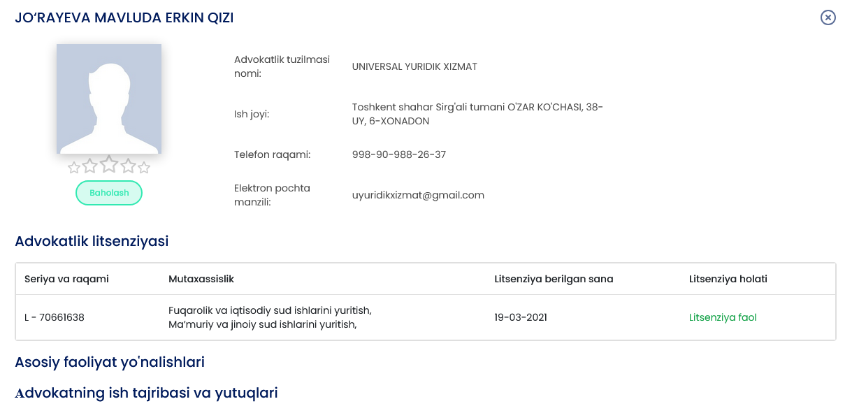 "Mening shirkatim bilan bog'liq murakkab huquqiy masalani hal qilishda Universal Yuridik Xizmat jamoasi juda yordam berdi. Ular o'z ishlarini professional ravishda bajardilar va meni yaxshi natijaga olib chiqishdi. Endi advokat kerak bo'lsa, ularga murojaat qilaveraman."